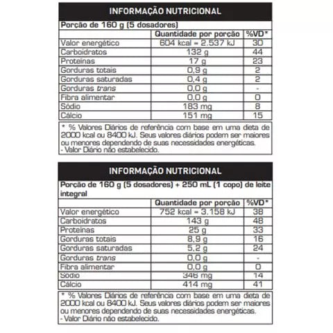 Mass Titanium 17500s 1,4kg : Este produto oferece em 1 porção (equivalente à 5 dosadores) , 132g de Carboidratos – Maltodextrina, um carboidrato de rápida digestão – o que corresponde à 604 kcal! Além disso conta com 17g de proteína nesta porção – Whey Protein Concentrado, Albumina e Colágeno Hidrolisado. Se preparar uma porção com 250 ml de leite integral, você atingirá quase 750 kcal!